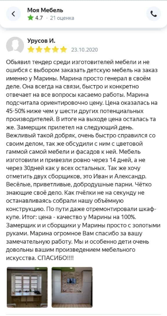 Меня зовут Марина и я уже более 15 лет работаю главным технологом на фабрике Моя Мебель. За это время мы выработали уникальную систему производства корпусной мебели без сколов и с минимальными допусками. Я с радостью помогу Вам подобрать мебель под любой интерьер и любых размеров. Наши курьеры поднимут изделие на Ваш этаж, даже если лифт не работает, а сборщики установят все за один день, без пыли и мусора.